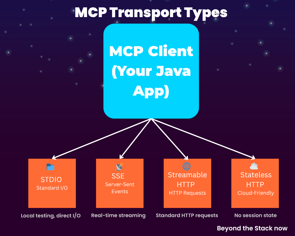 Depending on deployment needs, there are four MCP transport types. Think of them as different ways for your Java application and AI agent to ‘talk’: