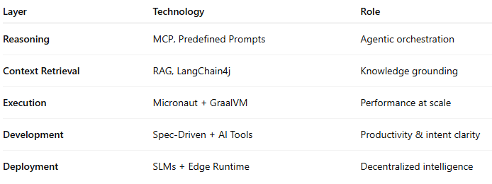 With Spring AI, MCP, RAG, Micronaut, and SLMs, the ecosystem has articulated a complete vision—intelligent systems that scale from cloud to edge, from enterprise to mobile, from centralized reasoning to distributed autonomy.