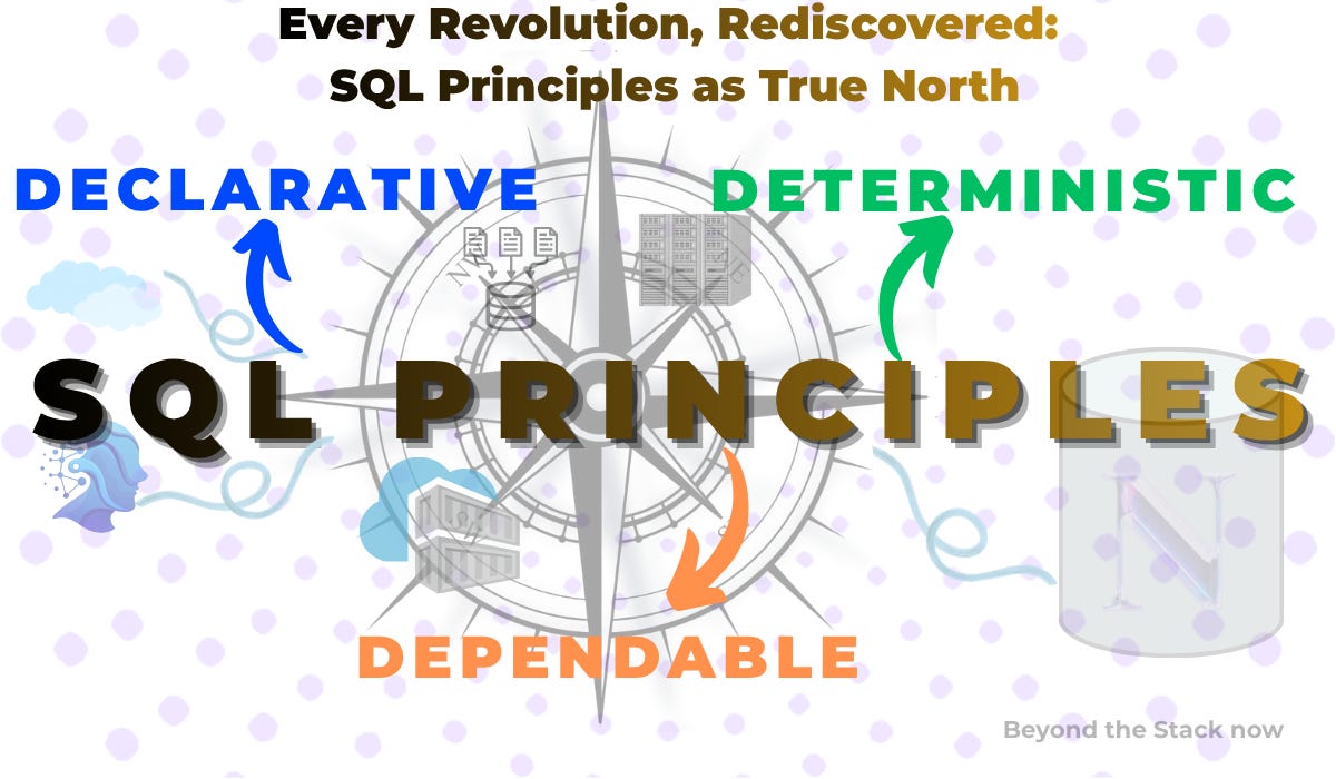 Every leap in data technology — whether it be NoSQL, cloud databases, analytics innovations, or AI-driven tools — begins by breaking SQL’s rules… but matures by rediscovering the foundational principles of SQL that continue to prove essential: Declarative, Deterministic, Dependable principles.