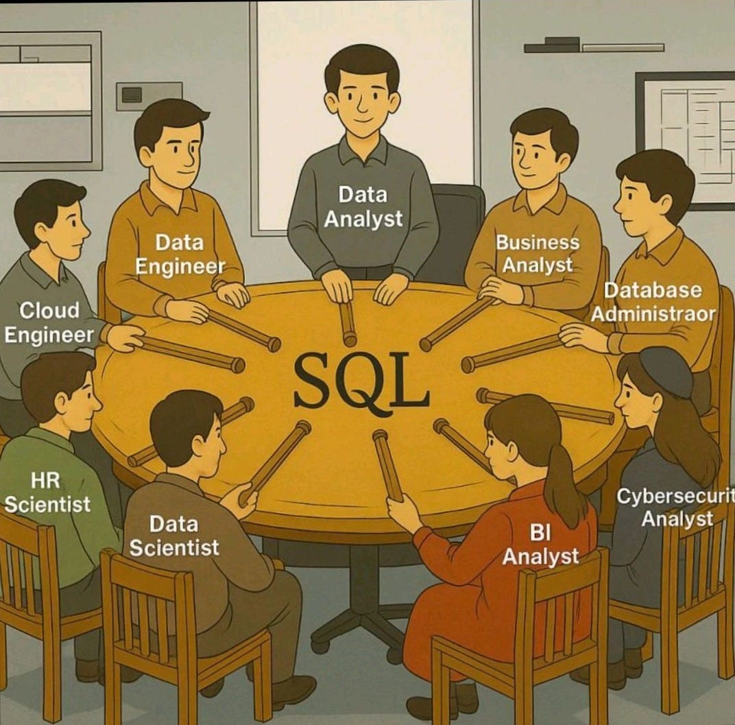 There’s a viral image making rounds in the data world: a roundtable where everyone, from Data Analysts to Cloud Engineers, holds a baton connecting to a single word at the center — SQL. It’s humorous but true. No matter how fragmented our tools or titles grow, SQL remains the universal language that unites us all.