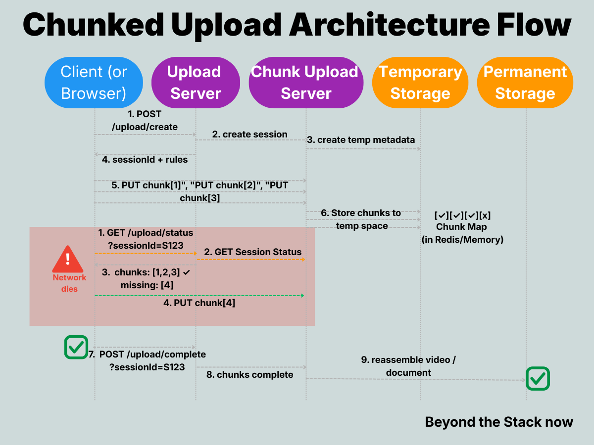 If you’re building upload APIs today, start with session IDs and chunk maps from day one. Retrofitting resumability into a monolithic upload endpoint is 10x harder than building it from the start.